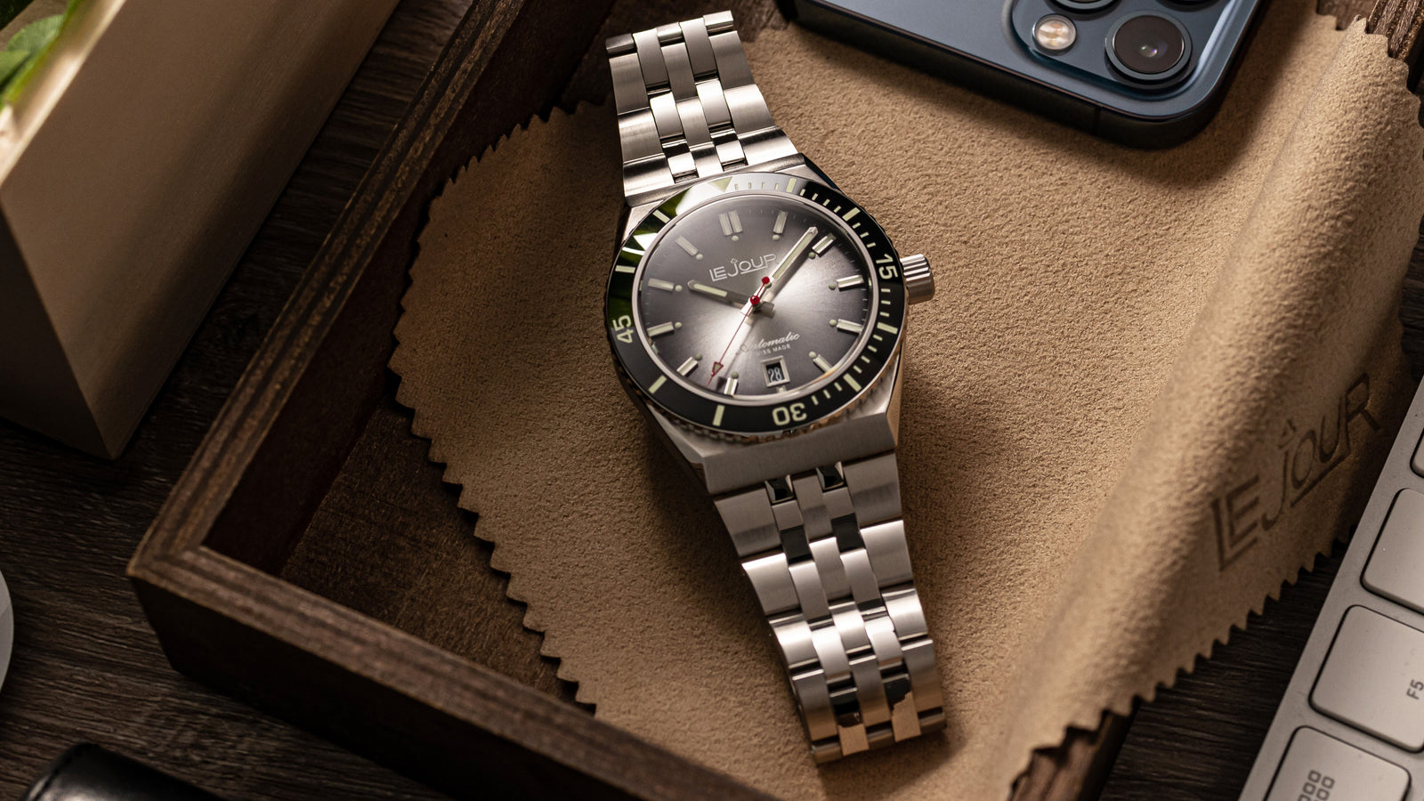 The Delmare features a breathtaking gradient sunburst, or fume finish, dial that captivates with its rich, dynamic depth. Lighter hues at the center seamlessly transition to darker tones at the edges, crafting a stunning visual effect that shimmers with movement. Enhanced by Super-LumiNova, this timepiece guarantees optimum legibility even in the darkest settings, making the Delmare not just a statement of elegance, but a reliable companion for every adventure.