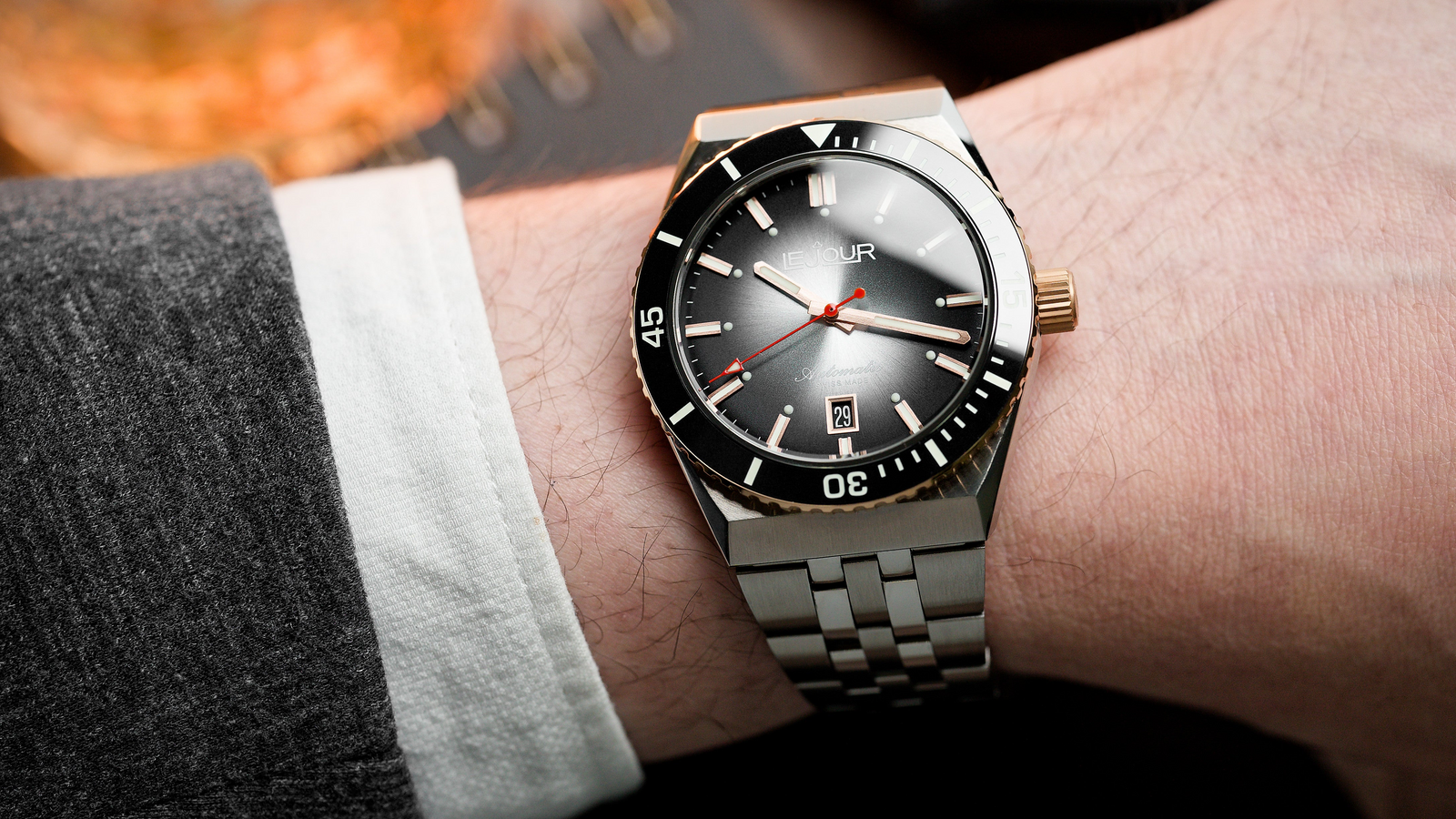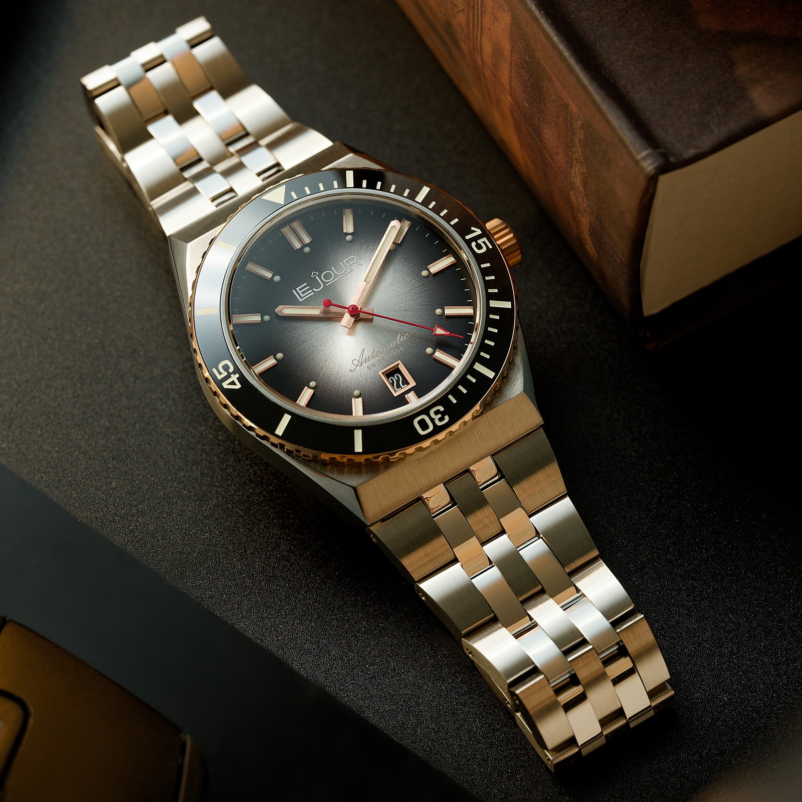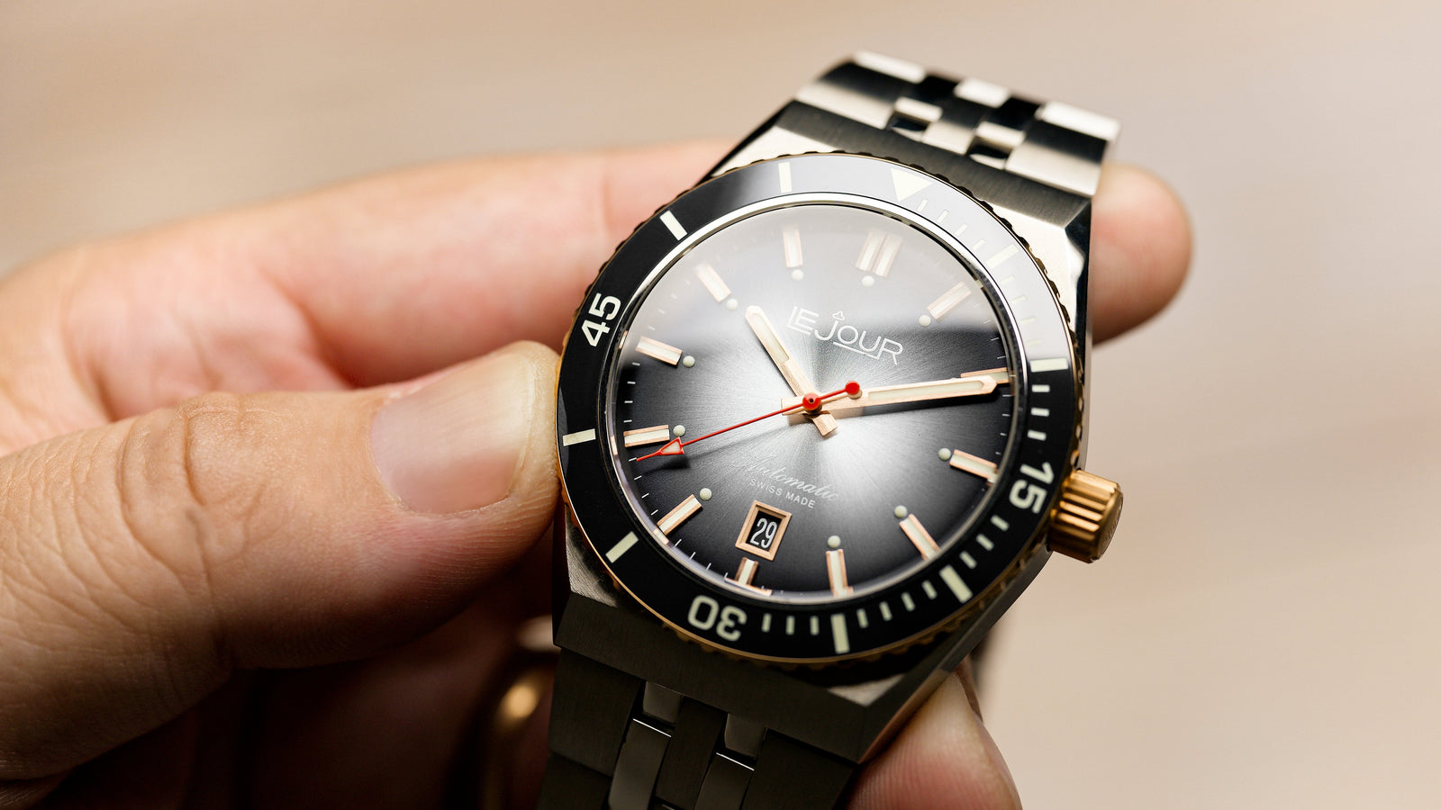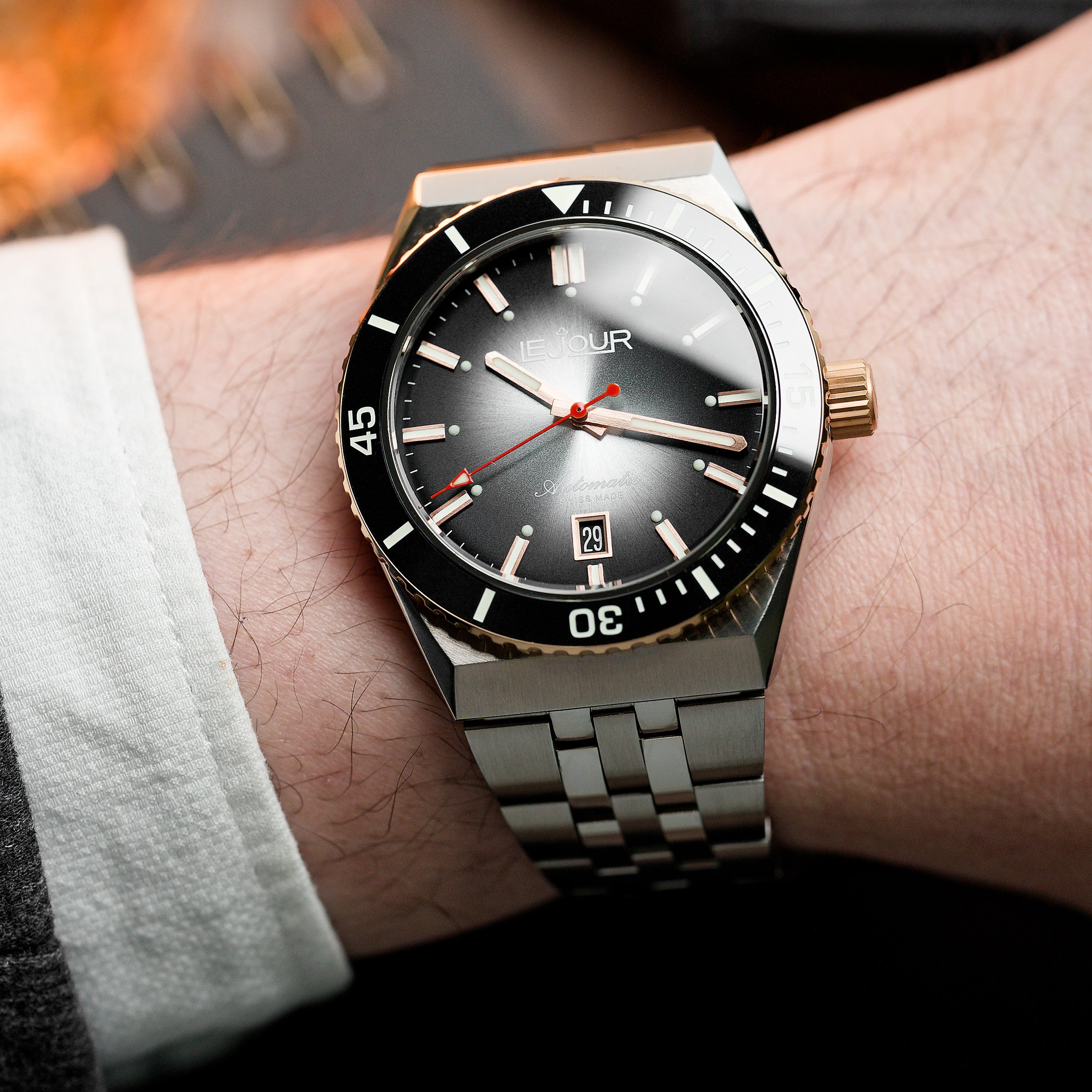 The Delmare features a breathtaking gradient sunburst, or fume finish, dial that captivates with its rich, dynamic depth. Lighter hues at the center seamlessly transition to darker tones at the edges, crafting a stunning visual effect that shimmers with movement. Enhanced by Super-LumiNova, this timepiece guarantees optimum legibility even in the darkest settings, making the Delmare not just a statement of elegance, but a reliable companion for every adventure.