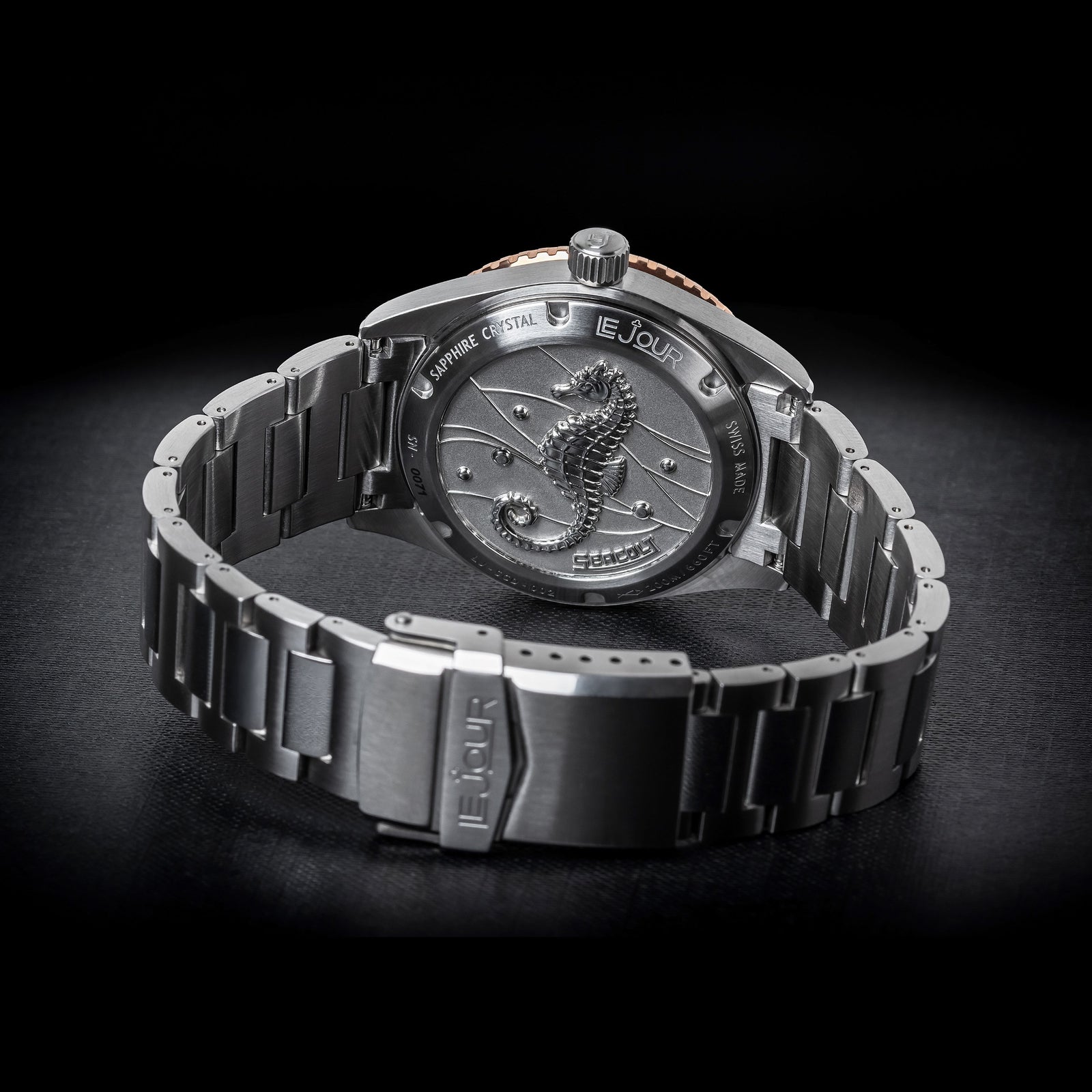 Seacolt features a brilliant motif of Seahorse deeply embossed on the Solid Steel Caseback, constructed for Water Resistance up-till 200m atmospheric pressure for your aquatic allures. Available in 5 exquisite color combinations of Black / Blue / Gray / Brown and Green dials, the Seacolt Diver is powered by the reliable 26-Jeweled SELLITA SW200 Swiss Made Automatic movement renowned for its accuracy, dependability and longevity.