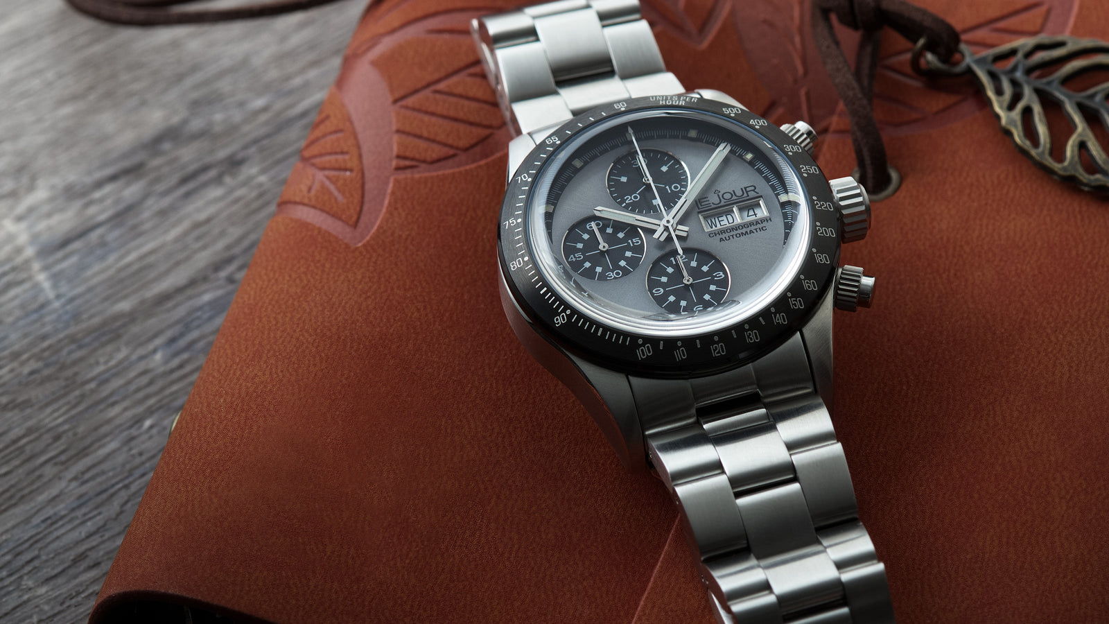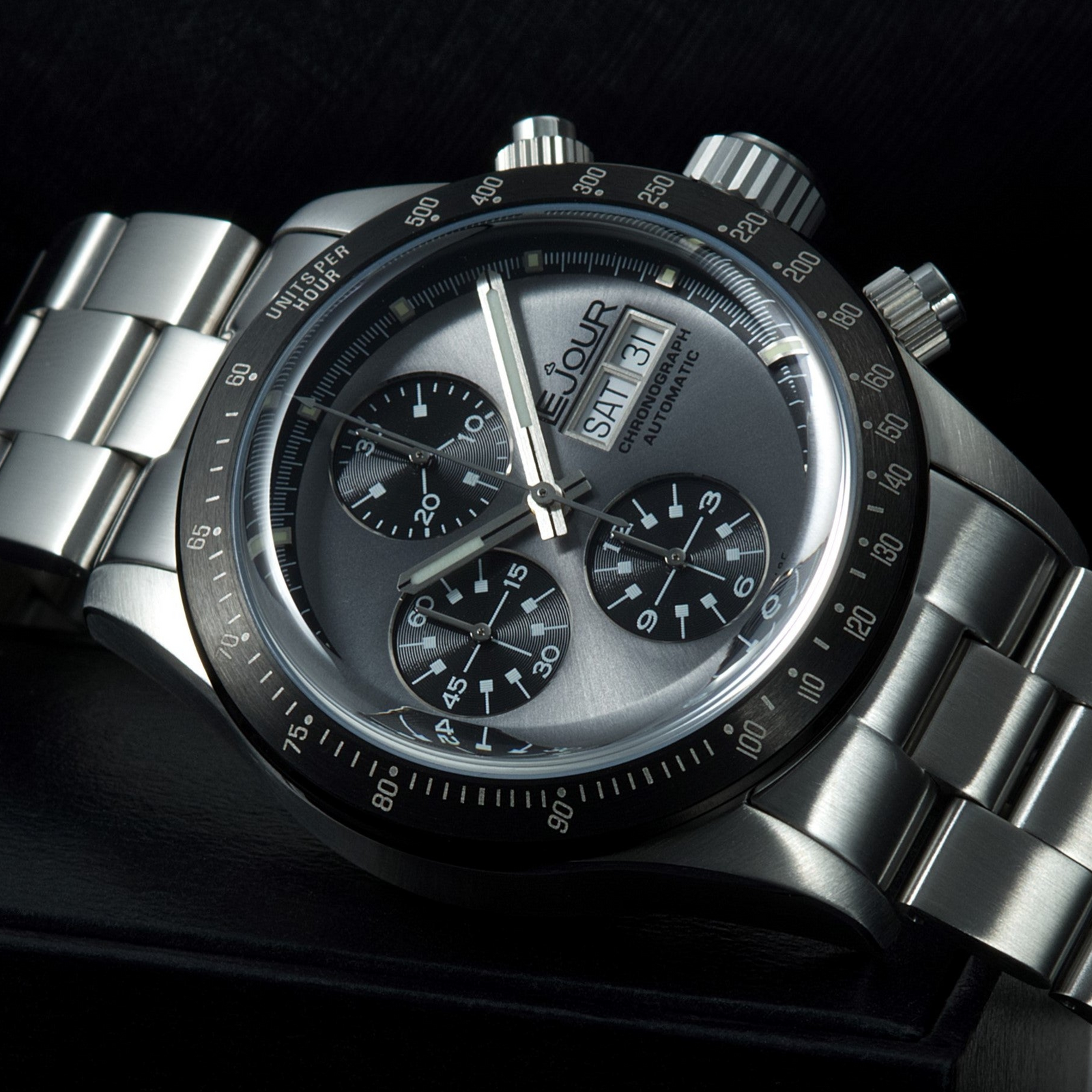 Showcasing a stunning Gray sunray finih dial with Black sub-dials in CD pattern, the combination is one of a kind exuding sophisticated and elegant style. Its recessed sub-dials add captivating visual depth, while a tachymeter ensures precision timing for the discerning enthusiast. Finished with a domed sapphire crystal, this timepiece exudes vintage charm, perfectly marrying classic aesthetics with modern functionality.