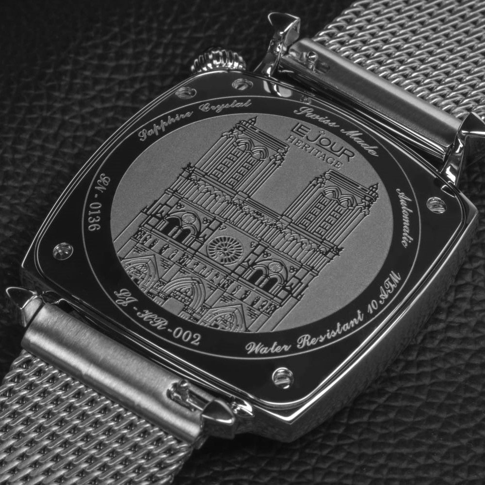 The caseback is made from solid steel and laser etched with one of the most beautiful heritage architectures in the world – Notre Dame cathedral of Paris.  The Heritage Timepiece is powered the time-tested 26 Jewel , Swiss Made Sellita SW200 Automatic movement.  With it’s unconventional aesthetics, premium quality components and reliable swiss mechanics, the Heritage timepiece is guaranteed to distinguish itself from it’s peers.