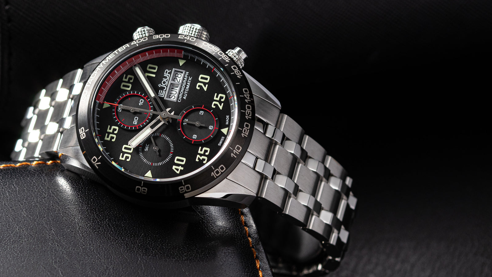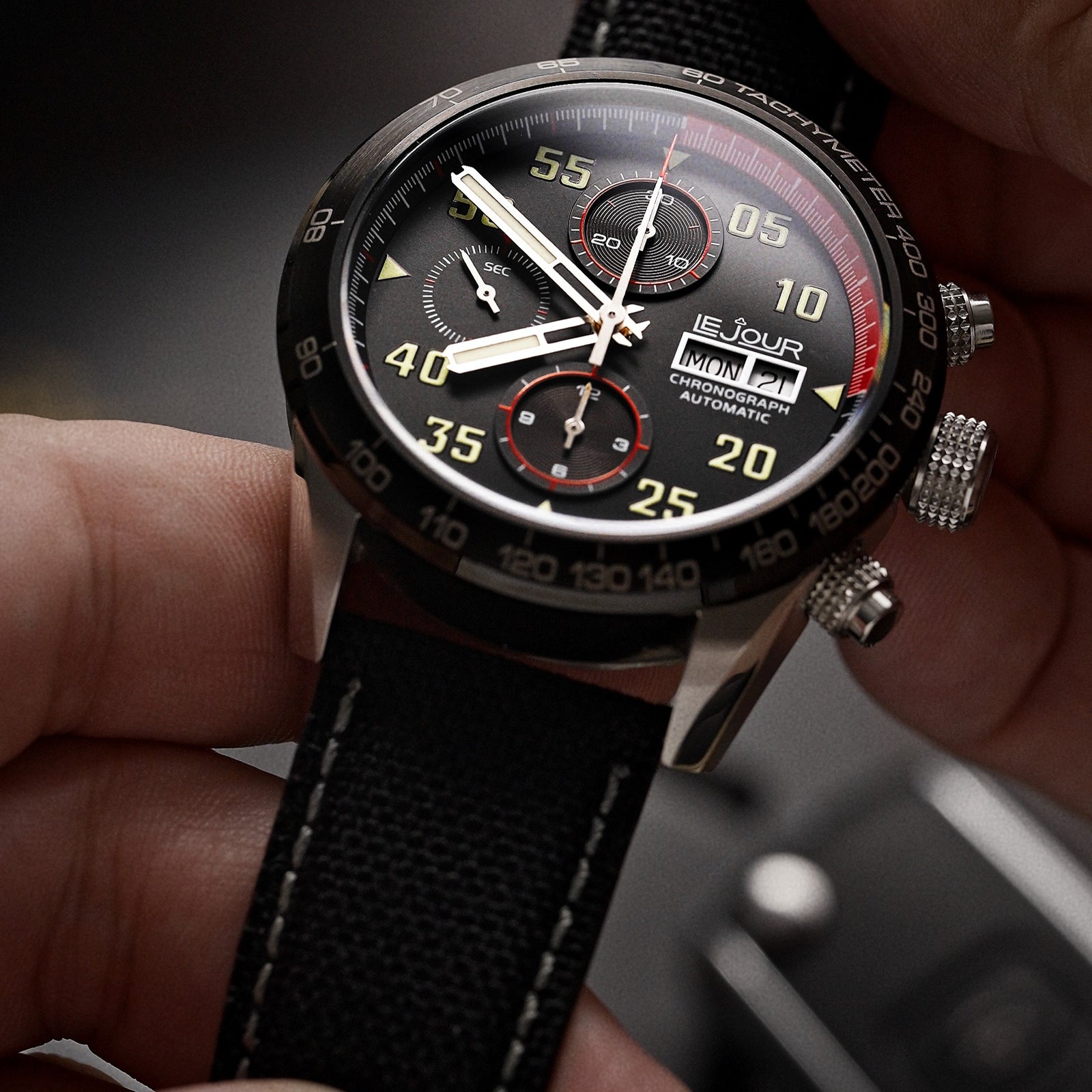 The RD Chrono encapsulates the spirit of motorsport, artfully merging sophisticated style with sporty accents and meticulous detailing. Encased in a polished-brushed stainless steel housing, it showcases Le Jour's superior craftsmanship. An additional Cordura® nylon strap enhances versatility and comfort. This elegant timepiece is the ideal companion for both racing enthusiasts and discerning connoisseurs, seamlessly transitioning from the racetrack to chic cafés.
