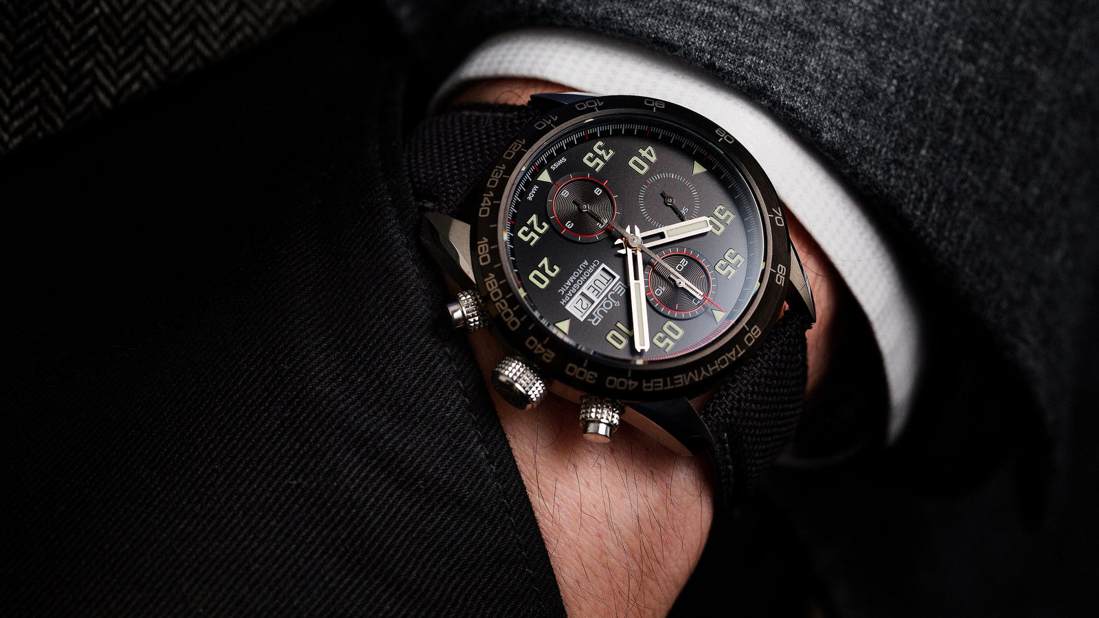 The RD Chrono's dial is a true homage to motorsports, showcasing vibrant red accents, circular-pattern sub-dials, and bold Arabic numerals. A bi-colored inner dial ring enhances its racing-inspired aesthetic. The hands and indices are treated with Swiss Super-LumiNova, ensuring legibility at all times, while the scratch-resistant sapphire crystal with anti-reflective coatings provides exceptional clarity.